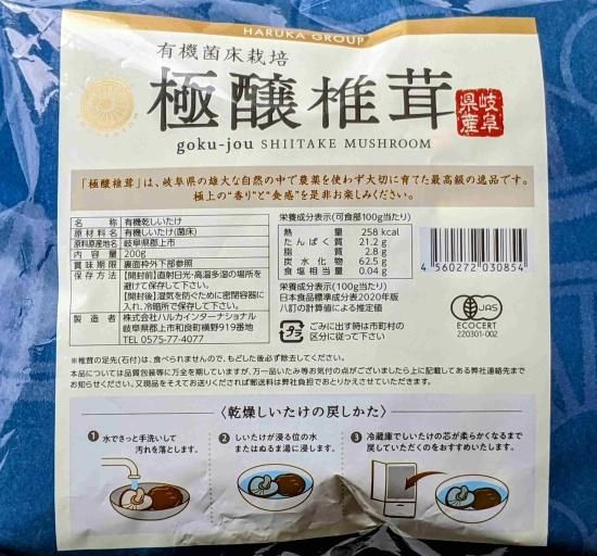 賞味期限あと1か月程度、在庫一掃お値打ち品にしました。香りと品質の定番商品、有機JAS乾燥シイタケの大袋200g入りパッケージ商品です。全国のコストコさんでも大人気の徳用大袋です。袋を開けた途端、その香り立ちに皆様がびっくりされます。ミシュランシェフの皆さんが「高級チーズと同じような甘い香りが料理の創造力を駆り立ててくれる」と評価してくれています。